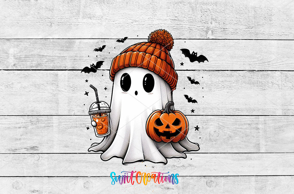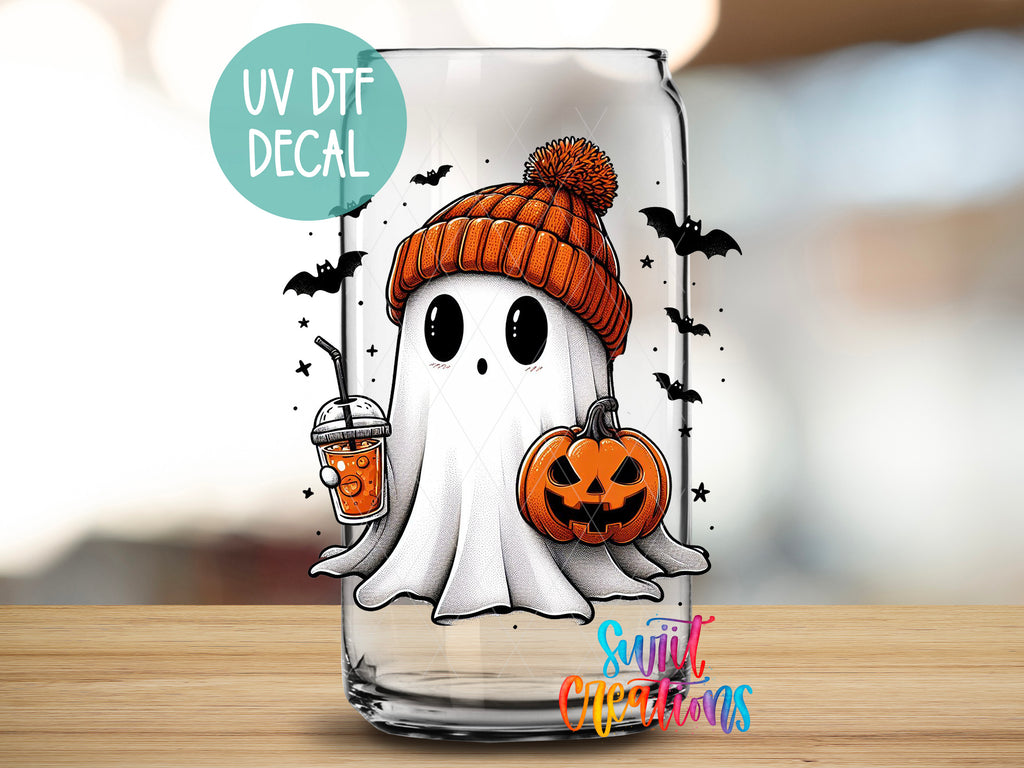 Cute Ghost with Pumpkin and Drink UV DTF Decal | UV1579