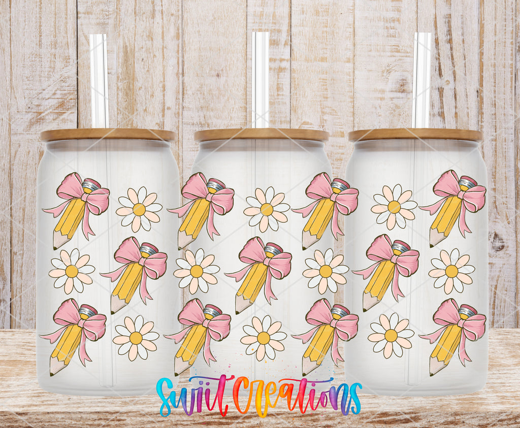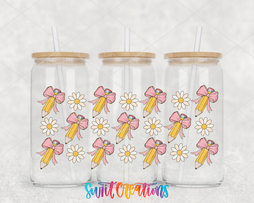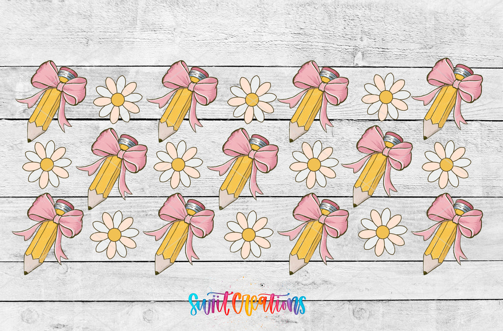 Pencils and Bows UV DTF Wrap | Pink Bow and Daisy Tumbler Decal | Teacher Appreciation Cup Sticker Design | DTF268