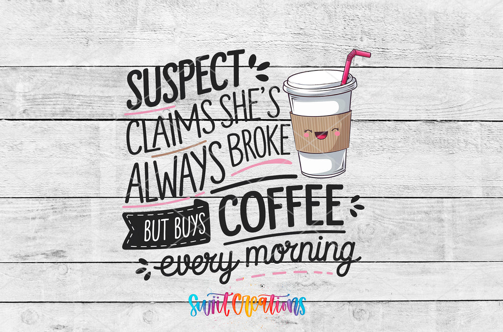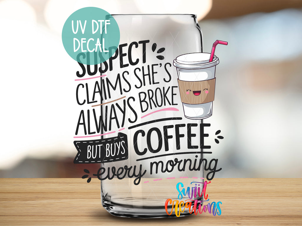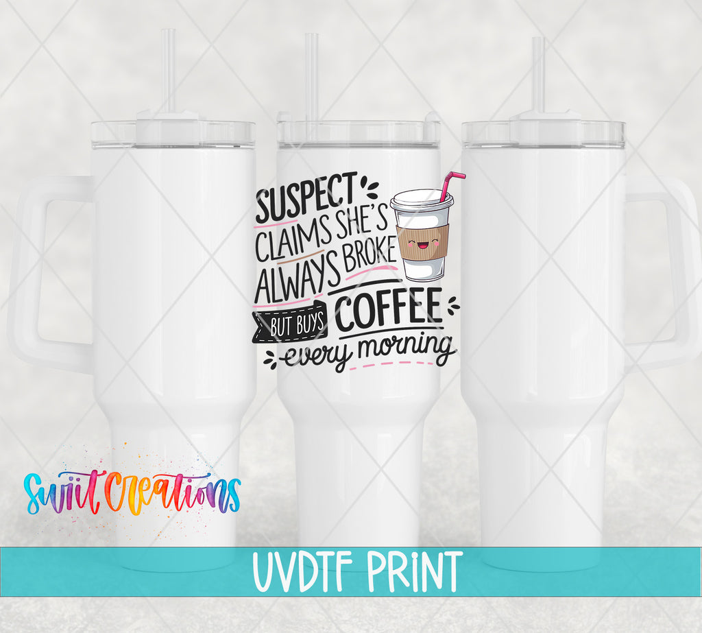 Suspect Claims She is Always Broke But Buys Coffee Every Morning UV DTF Decal UV1429