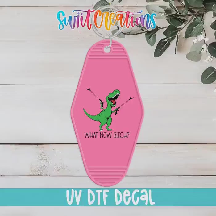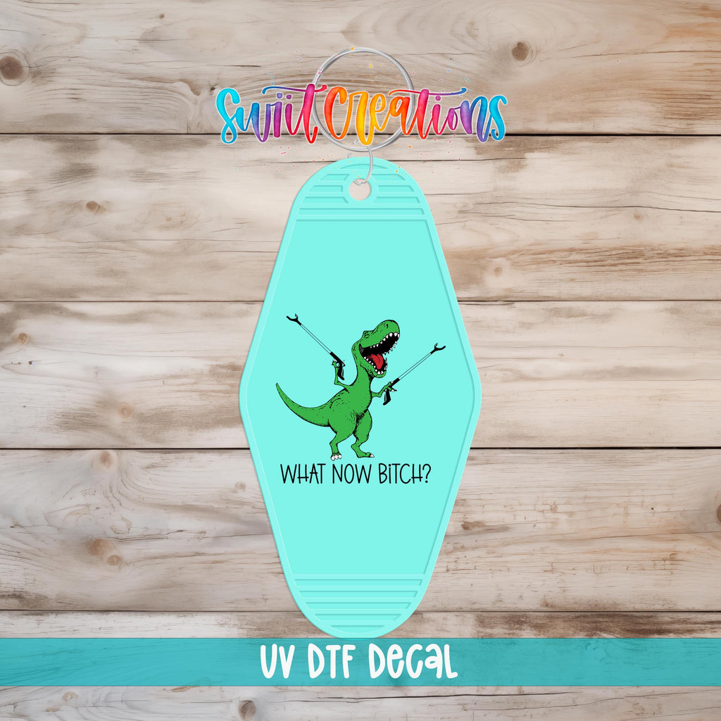 What Now Bitch Motel Keychain UV DTF Transfer | Funny Dinosaur Design | MK788