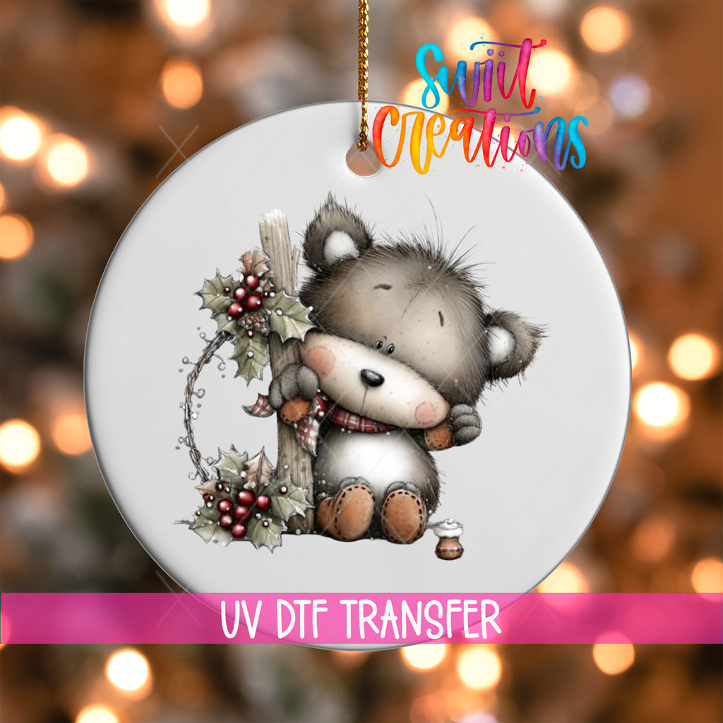 Whimsical Bear With Holly Christmas UV DTF Ornament Decal | O-1755