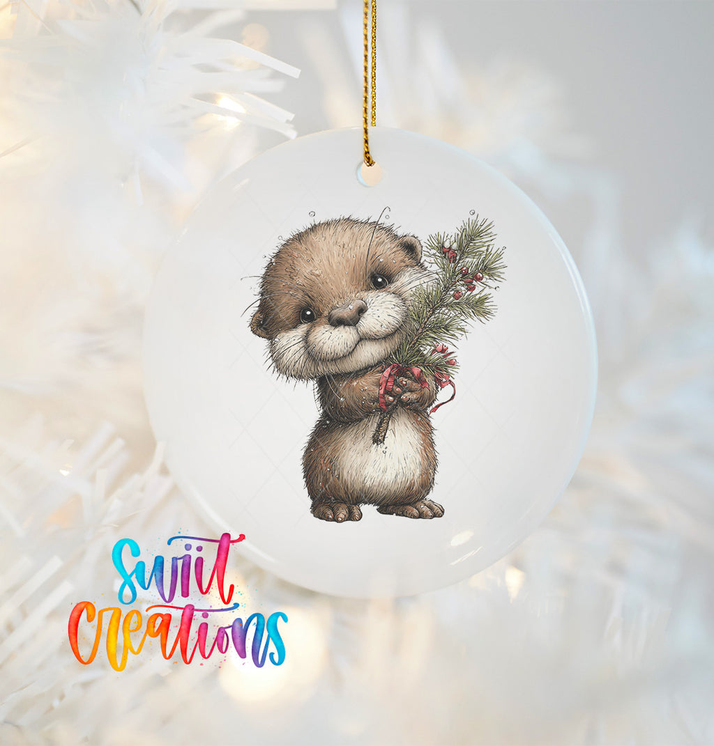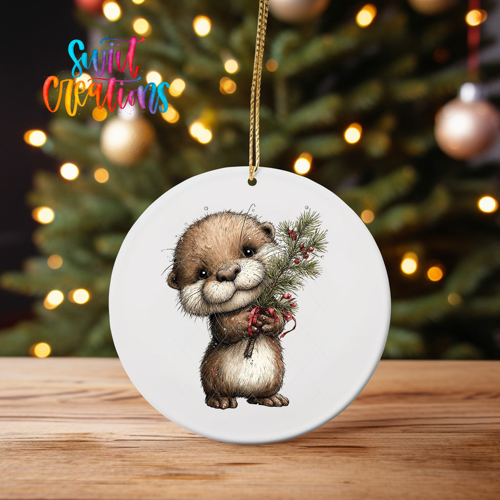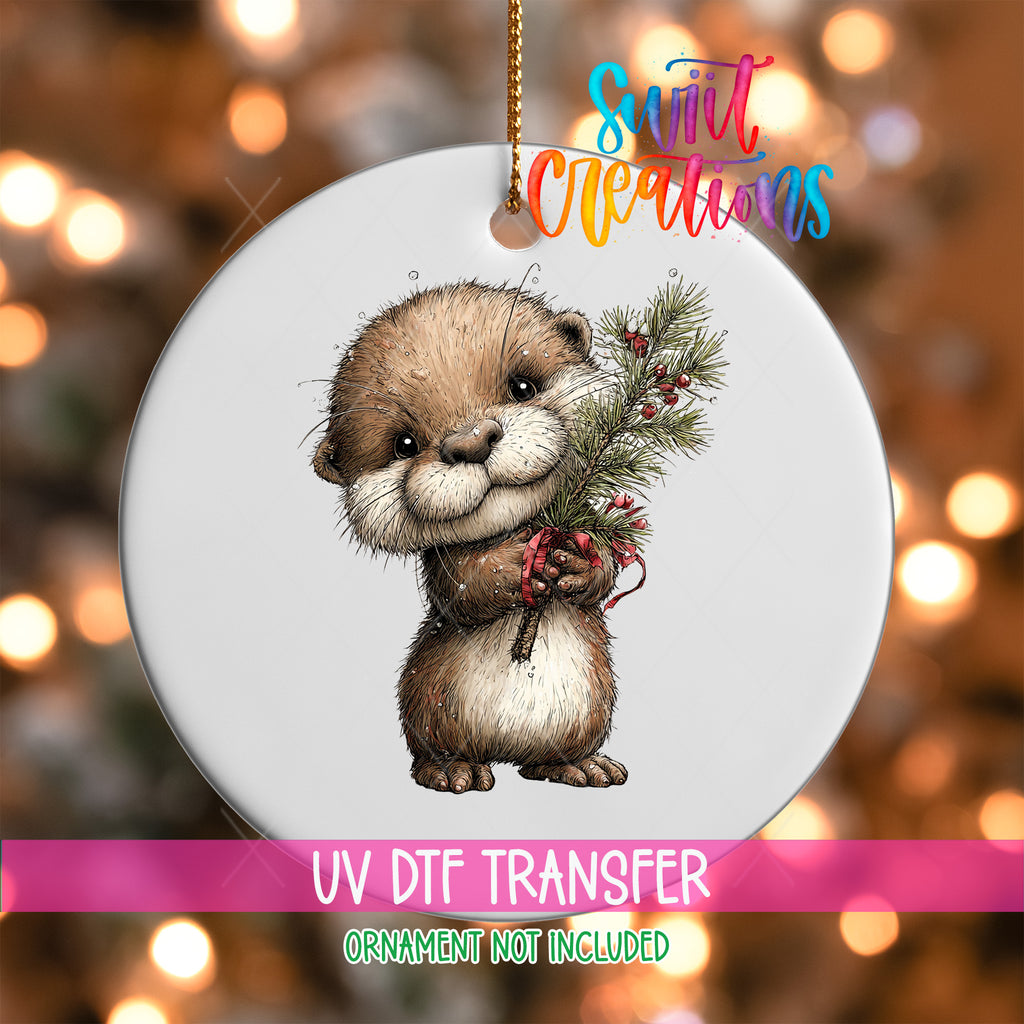 Woodland Otter Holding Greenery Christmas Ornament UV DTF Transfer Holiday Animal Winter Decor | O-1879